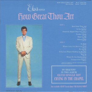 HOW GREAT THOU ART (LP) (US) RCA LSP / LPM 3758 Released: February 1967 Side 1 How Great Thou Art * In The Garden *** Somebody Bigger Than You And I *** Farther Along *** Stand By Me ** Without Him *** Side 2 So High *** Where Could I Go But To The Lord **** By and By *** If The Lord Wasn't Walking By My Side **** Run On * Where No One Stands Alone ** Crying In The Chapel * Recorded: RCA Studio B, Nashville, May 25, 1966 |