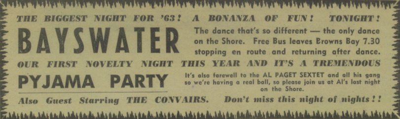 "Although the band has been kept busy in Auckland with recording dates, TV appearances on National Shows like "In The Groove" and "Teen '63" and personal dancestands at the Civic Wintergarden and Oriental Ballroom, North Island teenagers should soon see the Al Paget Sextet personally. For the group is commencing a series of 2-3 night stands throughout the Island. So far they have had a successful season at the Mount during new year, as well as stands at Hamilton, Taumaranui, Te Aroha and other provincial towns."