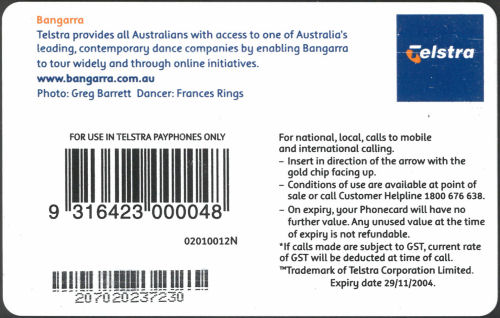 02010012N-C-11/04 Card Code: 02010012N Chip Type: C - Siemens - S35 Expiry Date: 11/04 Denomination: $10.00 Bangarra Dance Theatre Chip On Front Quantity Issued: |