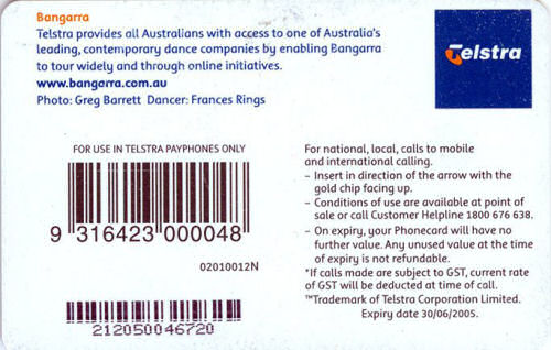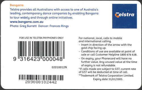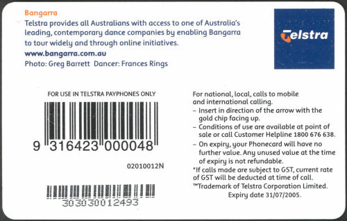 02010012N-C-07/05 Card Code: 02010012N Chip Type: C - Siemens - S35 Expiry Date: 07/05 Denomination: $10.00 Bangarra Dance Theatre Chip On Front Quantity Issued: |