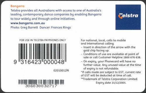 02010012N-C-12/05 Card Code: 02010012N Chip Type: C - Siemens - S35 Expiry Date: 12/05 Denomination: $10.00 Bangarra Dance Theatre Chip On Front Quantity Issued: |