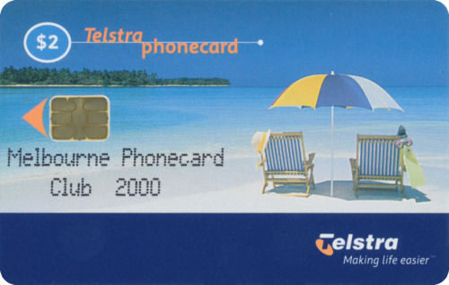 00002003P-C-06/02 Card Code: 00002003P Chip Type: C - Siemens - S35 Expiry Date: 06/02 Denomination: $2.00 Beach Scene 3 - Overprinted "Melbourne Phonecard Club 2000" Chip On Front Quantity Issued: |