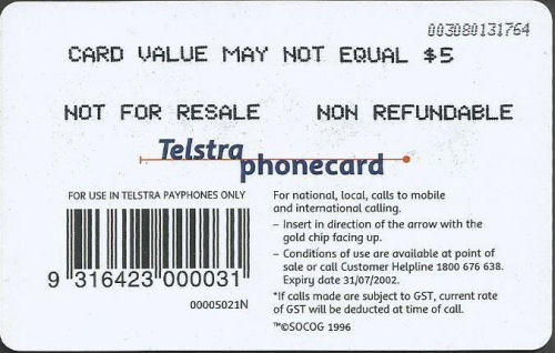 00005021N-C-07/02 (a) Card Code: 00005021N Chip Type: C - Siemens - S35 Expiry Date: 07/02 Denomination: $5.00 Olympic Mascots & Technology Chip On Front Quantity Issued: Printed on the back of the card is "Card value may not equal $5 not for resale non refundable". |
