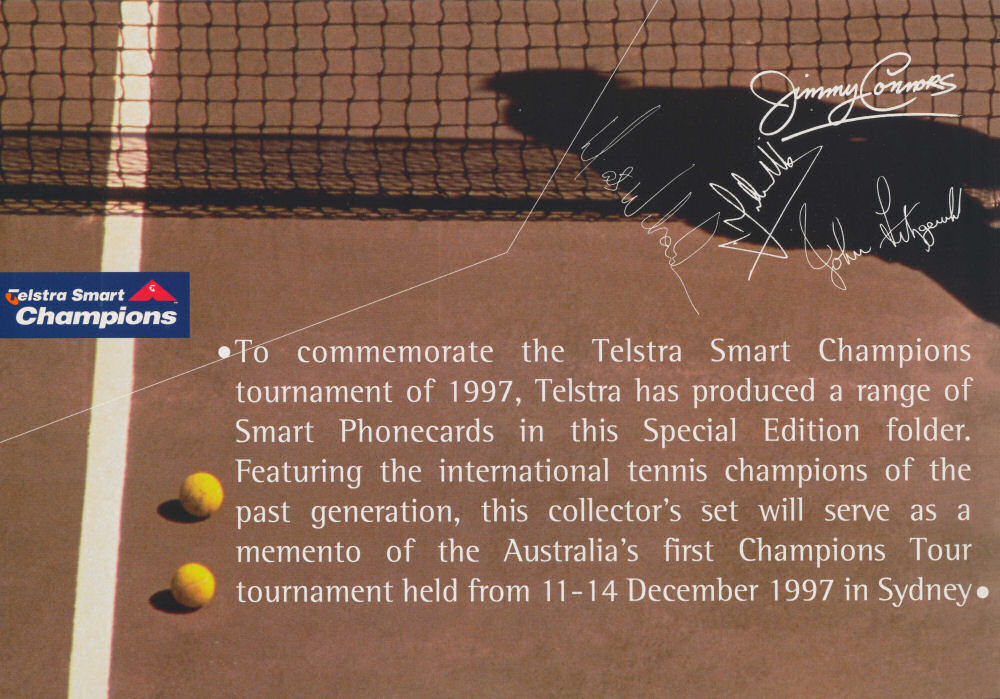 97010032P-A-01/00 Card Code: 97010032P Chip Type: A - Incard - IN1 Expiry Date: 01/00 Denomination: $10.00 Telstra Smart Champions - Tennis - Connors Chip On Back Quantity Issued: 1,000 + 1,000 in Folder |