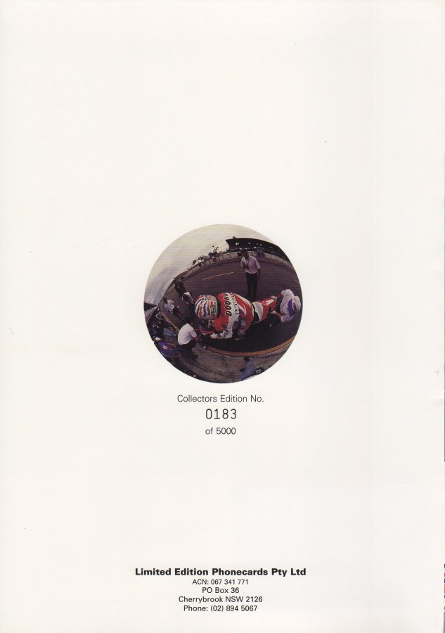 The Michael Doohan Pack was issued in April 1995. Quantity produced was 5,000, with 4,600 packs being returned to Telstra for destruction. For details on this card, refer MICHAEL DOOHAN. The pack did not sell as well as expected by the producer. This was partly due to the fact that it was a $20 card being issued at $59.50, and also that there were a number of other custom cards flooding the market at the time. With 4,600 cards being returned to Telstra, leaving a maximum of 400 folders, and Doohan going on to win a further two World Championships, after the release of this card, the packs popularity has increased, but remains very rare. |
