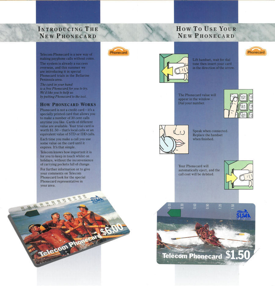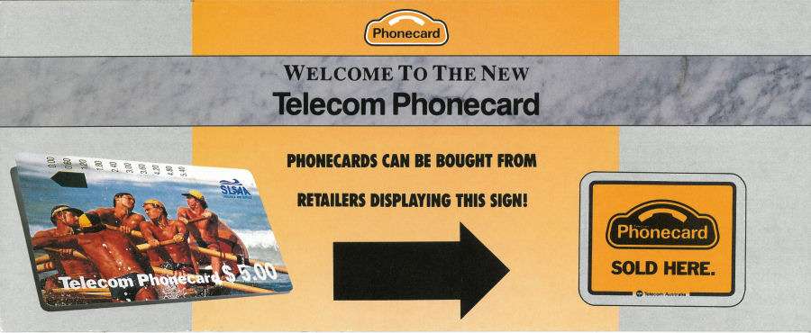 This first Geelong Field Trials Pack was issued for free during the Geelong Phonecard Trials in the Bellarine Peninsula holiday area of Victoria. These trails were conducted over the Christmas 1989, and New Year 1990 holiday period. ![]() From the low Card Number on the Phonecard in this pack, it would appear probable that at least the first two boxes of Prefix 3 $1.50 Geelong Trials - Surf Boats Phonecards, with S/Nos ranging from 3 00000 to 3 01999, were put into these packs and issued during the Geelong Trials. Quantity produced is likely to be around 2,000. For details on this card refer GEELONG TRIAL - SURF LIFE SAVING ASSOCIATION. Other items that were handed out during these trials were a Cardboard Handout and a Self-Adhesive Sticker. Both used the same image. ![]() Interesting observation is that this handout shows the card as a $5.00 and not the $6.00 as issued. |