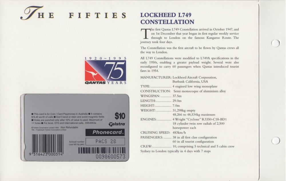 The Qantas 75 Years Pack was issued in November 1995. Quantity produced was 3,000. (It is likely that less than 1,000 were issued). For details on these cards, refer QANTAS 75 YEARS. Images For Pack 0573 ![]() ![]() ![]() ![]() ![]() ![]() ![]() ![]() ![]() |