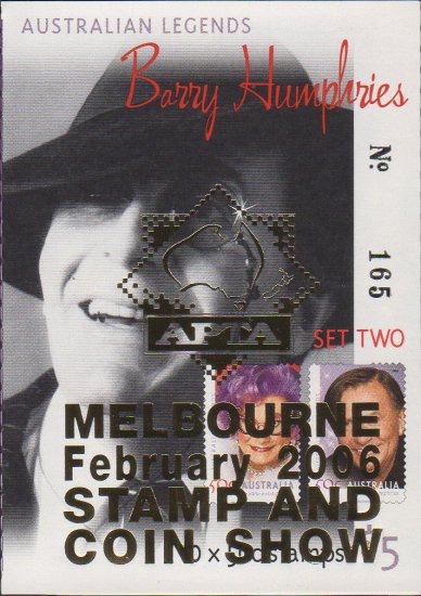 There were two booklets in this set. Dame Edna There were General barcode and Philatelic barcode versions for each booklet. There was one overprint available for each of the two booklets in the set. It was APTA Melbourne (both barcodes). |