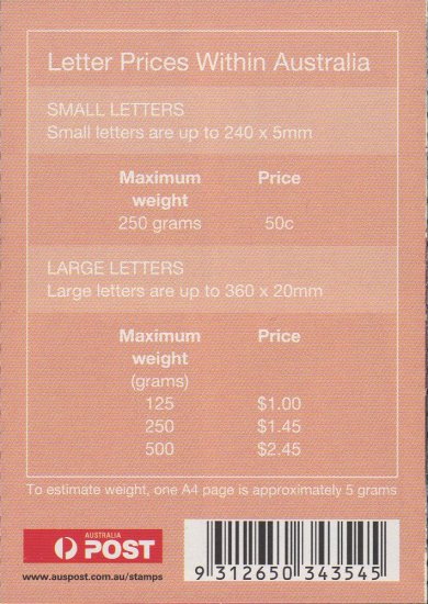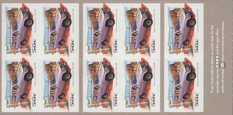 There were General barcode and Philatelic barcode versions of this booklet. There were two overprints available for this booklet. They were 50th Anniversary Sutherland Philatelic Society (both barcodes) and APTA Sydney (both barcodes) |
