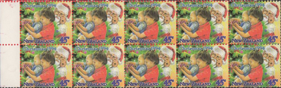 | A block of 10 (5 x 2) of 45c Father Christmas and Children. Red foldable cover with flap incorporating a hanging slot. Barcode on back cover. | |||